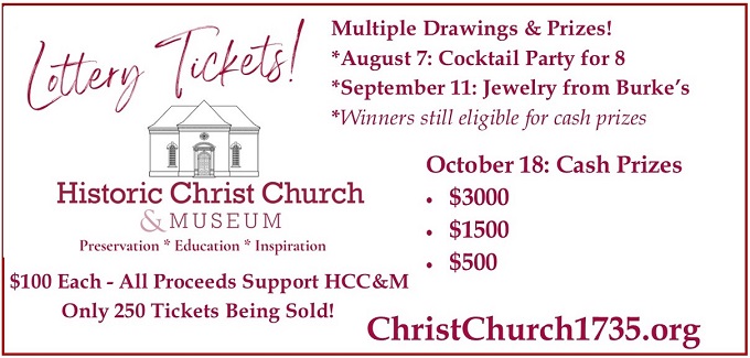 Thanks to everyone who participated in the 2025 lottery at Historic Christ Church & Museum. Congratulations to our interim prize winners and our three cash prize winners. Check back in 2026 for details on next year's lottery!